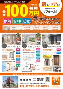 event 窓から省エネリフォーム! 超大型補助金 窓やドアのお悩みありませんか? 補助金を使ってお得にリフォーム! 補助金の申請は、登録業者である弊社にお任せください! Application イベントへのお申し込みはこちらから STEP.1 必要事項の入力 STEP.2 入力内容の確認 STEP.3 お申し込み完了 STEP.1 必要事項の入力 STEP.2 入力内容の確認 STEP.3 お申し込み完了 STEP.1 必要事項の入力 STEP.2 入力内容の確認 STEP.3 お申し込み完了 必須イベント名 必須参加希望日 必須参加人数 必須お名前 必須メールアドレス 任意郵便番号 住所検索 必須住所 任意電話番号 任意お問い合わせ内容 ※当社が保有する個人情報に関して適用される個人情報保護法およびその他の法令・規範を遵守いたします。内容をご確認の上、よろしければ上記の「入力内容を確認する」ボタンを押して下さい。 ※このサイトはreCAPTCHAを利用しており、下記内容の他、Googleプライバシーポリシーおよび利用規約が適用されます。 個人情報利用目的 ・お客様のご要望に合わせたサービスを提供させていただくための各種ご連絡。・お問い合わせいただいたご質問への回答のご連絡。尚、お客様から収集する個人情報は弊社の定めるプライバシーポリシーに則って厳重に管理いたします。 プライバシーポリシー 株式会社二葉屋では、ホームページ(以下、「当サイト」といいます。)の運営に際し、お客様のプライバシーを尊重し個人情報に対して十分な配慮を行うと共に大切に保護し、適正な管理を行うことに努めております。 1.個人情報利用目的 お客様の個人情報は、原則として、当社のサービスに関する情報をご提供する目的や当社に対するご意見、ご要望に関する今後の改善、及び、問い合せに関するご回答のために利用致します。それ以外の目的で利用する場合は個人情報をご提供いただく際に予め目的を明示しておりますのでご確認下さい。 2.第三者への情報提供 お客様の個人情報は、以下の場合を除き第三者に開示、提供、譲渡、することは致しません。1.法的拘束力がある第三者機関からの開示要求がある場合2.協力業者と提携して業務を行う場合(協力業者にも適切な管理を行います)3.お客様本人の同意があった場合 3.開示等の請求等 お客様等が個人情報の利用目的の通知、個人情報の開示、訂正、追加若しくは削除を希望される場合は、希望される方が本人であることを確認の上速やかにこれに対応いたします。 4.安全管理 個人情報保護に関して適用される法令、規範を遵守するとともに正確かつ最新の内容に保ち安全管理のための必要かつ適切な措置を行います。 5.従業員の監督 弊社では、お客様等の個人情報の安全管理が図られるよう従業者に対する必要かつ適切な監督を致します。また、従業者に対して個人情報の適正な取り扱いの確保のために必要な教育を実施します。 6.クッキー(Cookie)の利用 当サイトではクッキー(Cookie)を利用しております。クッキー(Cookie)を使用する目的はお客様が当サイトを再訪された際に便利にお使い頂くことを目的に使用しており、お客様のプライバシーを侵害するものではありません。 7.適用範囲 本プライバシーポリシーは当サイト内にのみ適用されます。当サイトからリンクの張られている他のサイトでの個人情報保護についてはリンク先のプライバシーポリシーによって行われます。 8.漏えい発生時の対応 お客様等の個人情報の漏えい等が発生した場合には、事実関係を速やかにお客様等に通知するなど、迅速かつ適切に対応します。 9.継続的改善 弊社では、個人情報保護に関する内部規定の整備、従業者教育及び内部監査の実施などを通じて、社内における個人情報の取り扱いについて継続的な改善に努めます。 一覧へ戻る