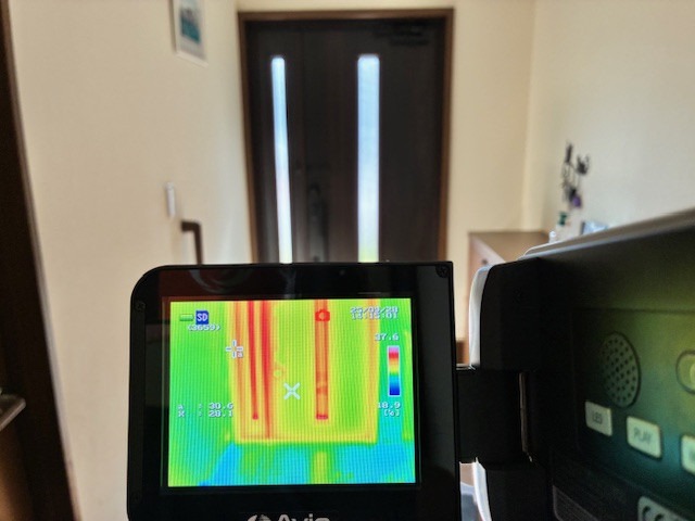 お邪魔したのが8月下旬の午後14時頃で、ここのお宅は午後から西日が玄関ドアにまともに当たるためアルミ製の玄関ドアの表面温度がかなり上がっていて手で触るとヤケドしそうな位熱かったです。